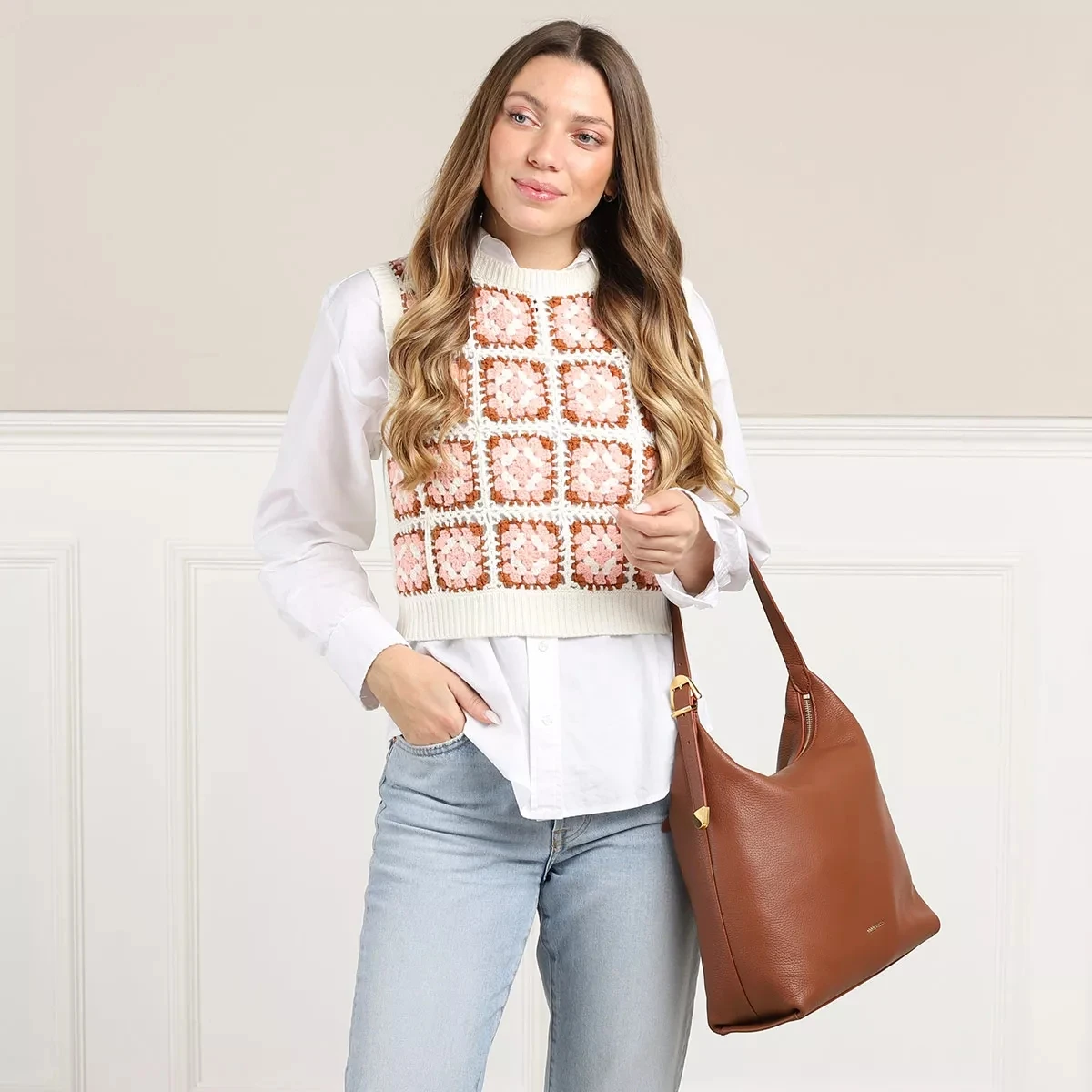 - Gefertigt aus genarbtem Leder in Cognacbraun
