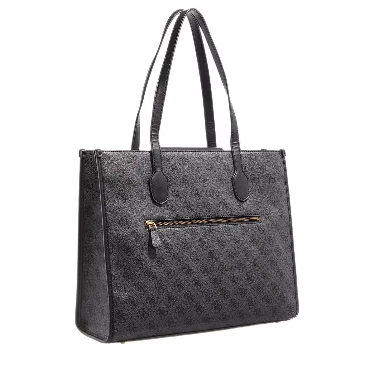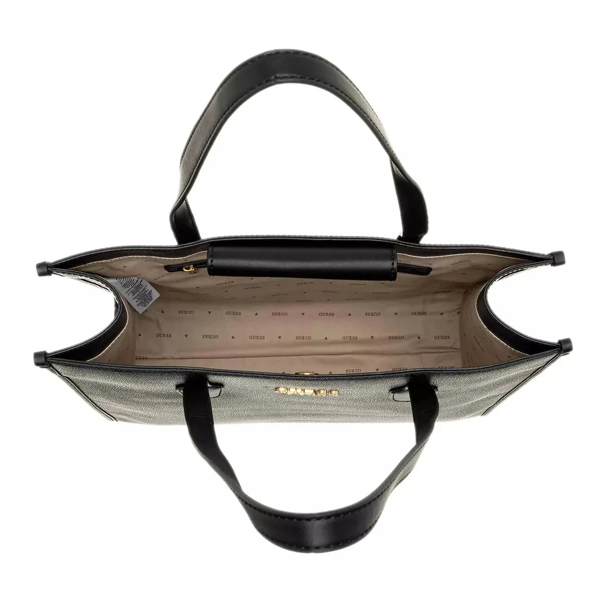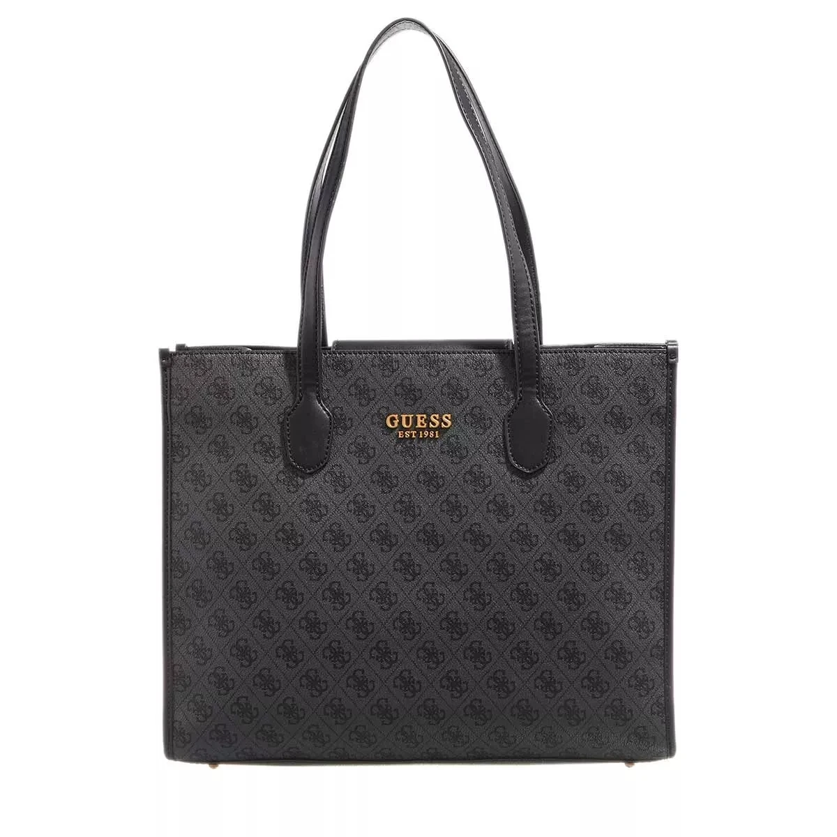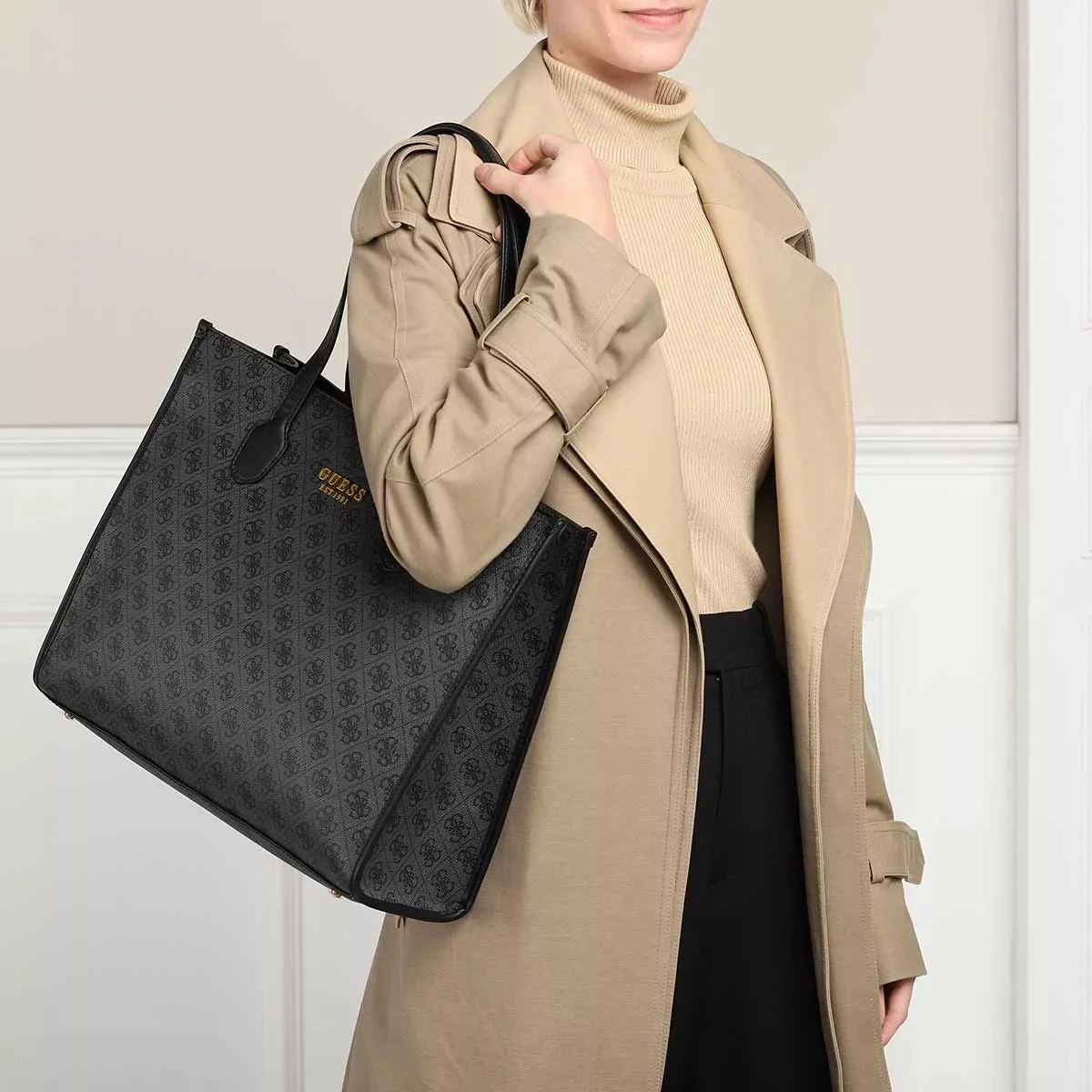 Der Silvana Shopping Bag Coal Logo von Guess ist schick und schlicht. Er hat die optimale Größe für den Arbeitsalltag – ob im Büro oder auf Geschäftsreise. Die amerikanische Lifestyle Marke Guess kombiniert seit 1981 zeitlosen Hollywood Glanz mit französischem Chic in einem unverkennbaren und eleganten Stil. Bestehend aus genarbtem Kunstleder in Schwarz und in Grau mit Print ist der Shopper ein unempfindliches Accessoire mit pflegeleichter Oberfläche. Mit goldfarbenen Metalldetails setzt der Shopper jeden Look edel in Szene. Der Tascheninhalt lässt sich flexibel und unkompliziert in einem Hauptfach unterbringen. Für Ordnung und separaten Schutz sorgen drei praktische Zusatzfächer. Es ist zudem ein Außenfach angebracht, das einen schnellen Zugriff auf wichtige Kleinigkeiten möglich macht.