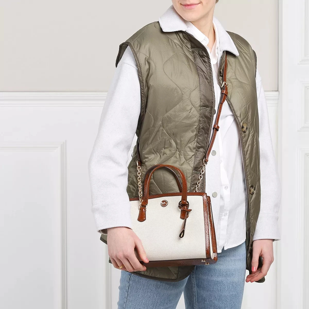 Die handliche Tote Bag Chantal Small Messenger Chestnut von Michael Kors vereint einen schlichten und minimalistischen Look.