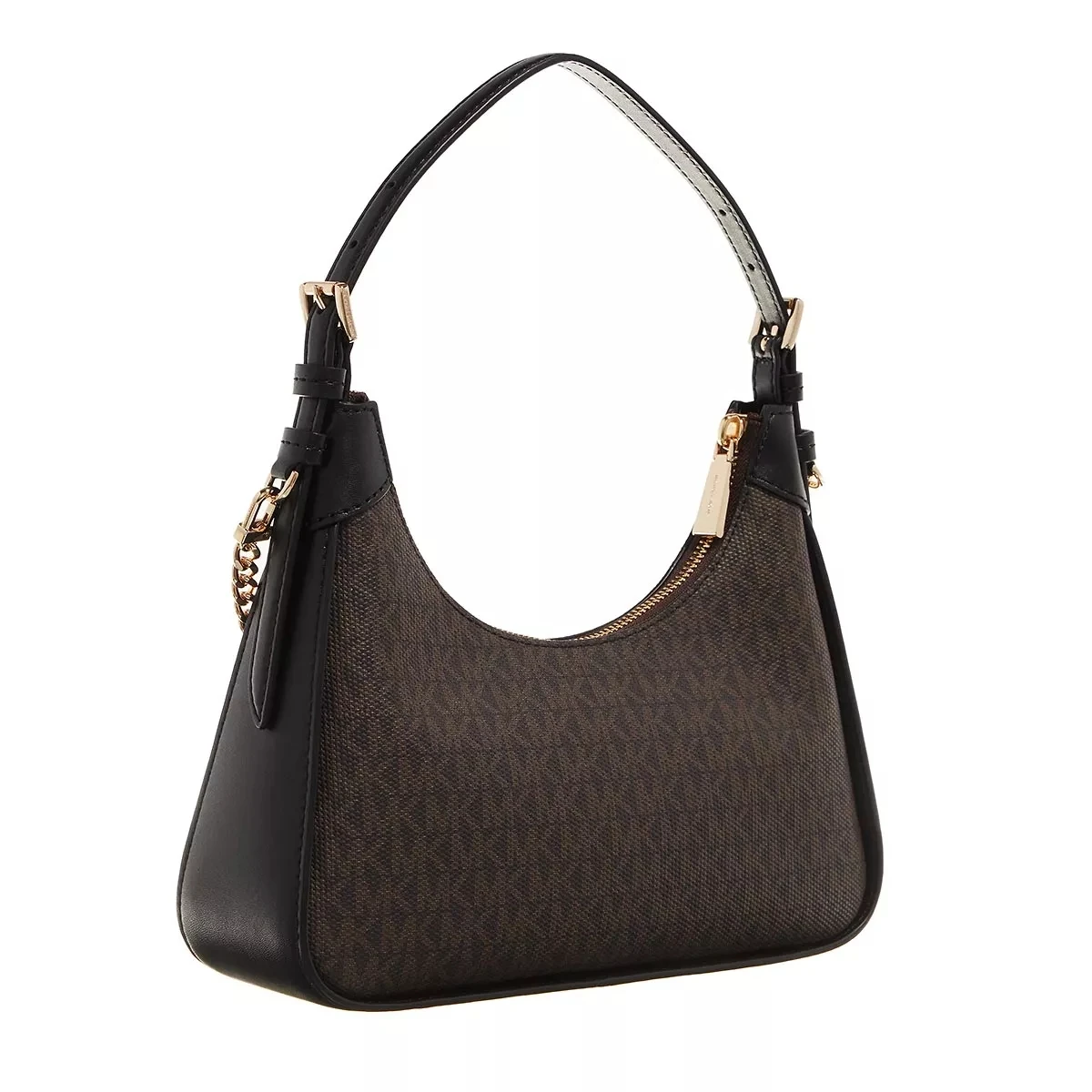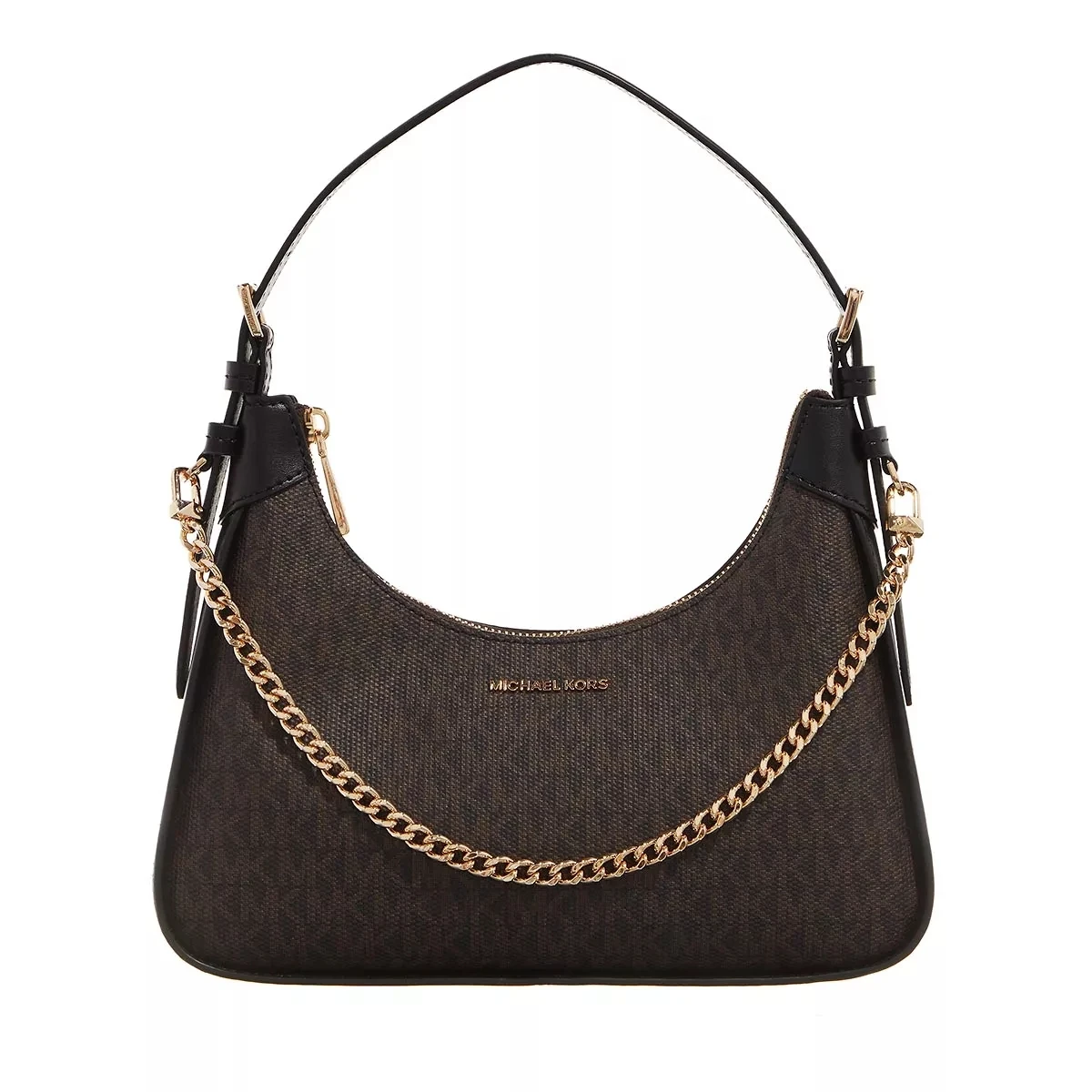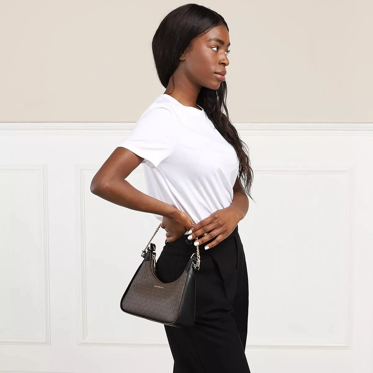 Schlicht und klassisch: Das ist die vielseitige Pochette Md Ew Pouchette Brown/Blk von Michael Kors. Sie besteht aus beschichtetem Canvas in Schwarz und in Braun, die ihr eine natürliche Textur verschaffen. Mit goldfarbenen Metalldetails setzt die Pochette jeden Look stilvoll in Szene. Der Tascheninhalt lässt sich sicher und unkompliziert in einem Hauptfach unterbringen. Für Ordnung und separaten Schutz sorgt ein praktisches Zusatzfach.